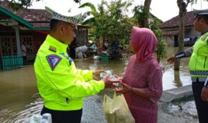 Sebagai wujud responsibilitas Satlantas terhadap, kesulitan yang dihadapi masyarakat, maka pihaknya membagikan ratusan nasi bungkus, dan air mineral kepada para sopir dan masyarakat yang terdampak banjir, kegiatan dilaksanakan di ruas jalan alternatif Sampang – Jakenan turut Desa Tondomulyo, Kecamatan Jakenan.