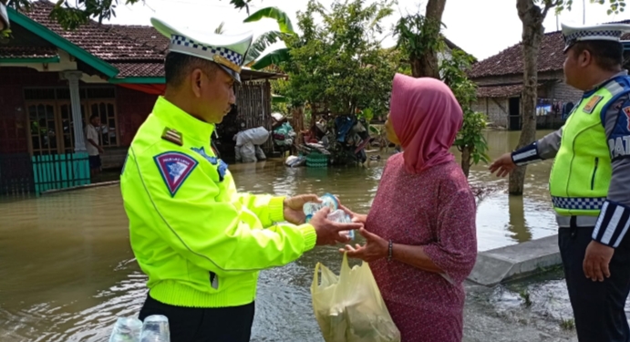 Sebagai wujud responsibilitas Satlantas terhadap, kesulitan yang dihadapi masyarakat, maka pihaknya membagikan ratusan nasi bungkus, dan air mineral kepada para sopir dan masyarakat yang terdampak banjir, kegiatan dilaksanakan di ruas jalan alternatif Sampang – Jakenan turut Desa Tondomulyo, Kecamatan Jakenan.