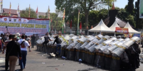 Massa kemudian melakukan tindakan anarkis, hingga Polres Kudus menerjunkan Dalmas dan regu satwa untuk menghalau massa yang semakin brutal. Petugas mencoba menghalau massa dan terjadi aksi saling dorong, petugas yang melihat adanya aksi pembakaran langsung memadamkan api dengan Apar.