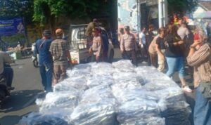Aksi demo nelayan Juwana ini dikawal aparat kepolisian dengan membantu jalannya pembagian ikan pada warga. Sebagian menjaga di ruas-ruas jalan di sekitar alun-alun agar tidak dilewati kendaraan umum.(jateng7.com./sbr Persatuan Nelayan Juwana Pati).