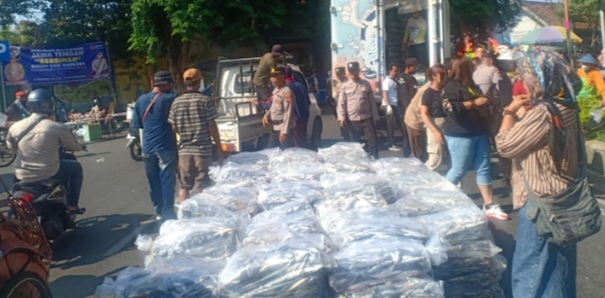 Aksi demo nelayan Juwana ini dikawal aparat kepolisian dengan membantu jalannya pembagian ikan pada warga. Sebagian menjaga di ruas-ruas jalan di sekitar alun-alun agar tidak dilewati kendaraan umum.(jateng7.com./sbr Persatuan Nelayan Juwana Pati).