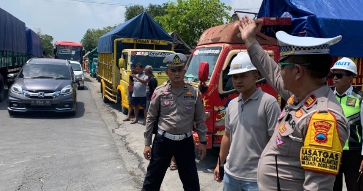 Kasat Lantas Polres Grobogan AKP Tejo Suwono terjun langsung ke jalan untuk melakukan pengaturan arus lalu lintas.