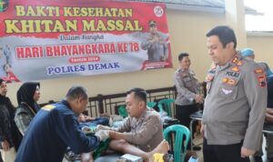 Jateng7.com.DEMAK – Sambut hari Bhayangkara ke-78 yang jatuh pada 1 Juli 2024 nanti, Polres Demak memggelar bakti sosial (Baksos) kesehatan meliputi donor darah, khitan massal dan pelayanan keluarga berencana (KB) gratis untuk masyarakat.