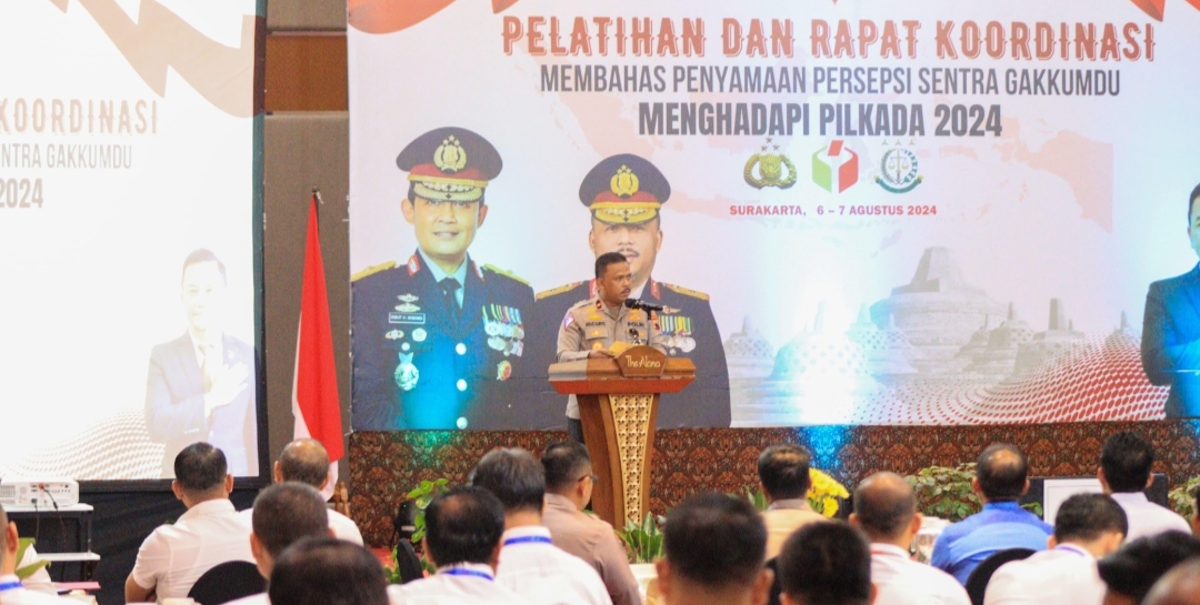 Jateng7.com.Karanganyar– Sebagai bentuk komitmen wujudkan pemilu aman dan lancar Polda Jateng gelar Pelatihan dan Rakor Sentra Penegakan Hukum Terpadu (Gakkumdu) Pilkada 2024 di The Alana Hotel Convention Center, Kab. Karanganyar pada Selasa (6/8/2024) pagi.