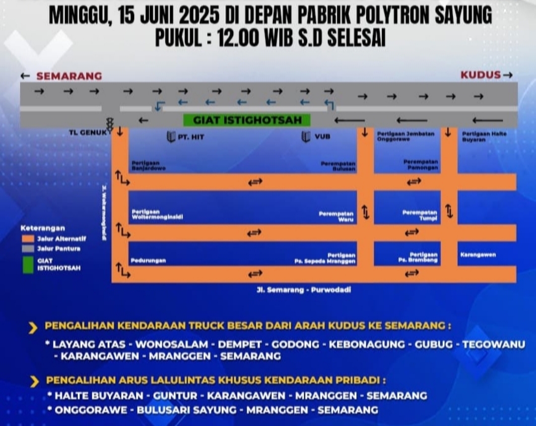 Ari mengungkapkan, pihaknya juga bekerjasama dengan Polrestabes Semarang dalam pengalihan arus lalu lintas. Ia mengimbau agar masyarakat menghindari Pantura Demak – Semarang pada tanggal tersebut guna menghindari ketersendatan arus lalu lintas dan menggunakan jalur alternatif yang sudah disiapkan Kepolisian.