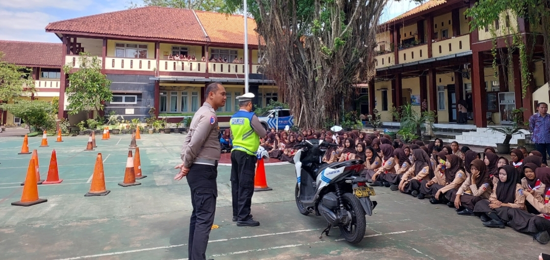 Iptu R Suko menghimbau siswa-siswi untuk menggunakan helm SNI, tidak melawan arus, dan menggunakan knalpot standar.