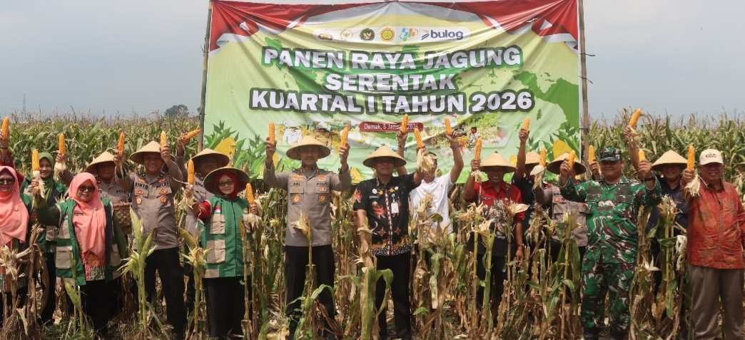 Jateng7.com.DEMAK – Polres Demak melaksanakan kegiatan Panen Raya Jagung Serentak Kuartal I Tahun 2026 sebagai bentuk dukungan terhadap Program Swasembada Pangan Nasional. Kegiatan tersebut dipimpin langsung oleh Kapolres Demak AKBP Ari Cahya Nugraha di Desa Sumberejo, Kecamatan Mranggen, pada(8/1/2026).